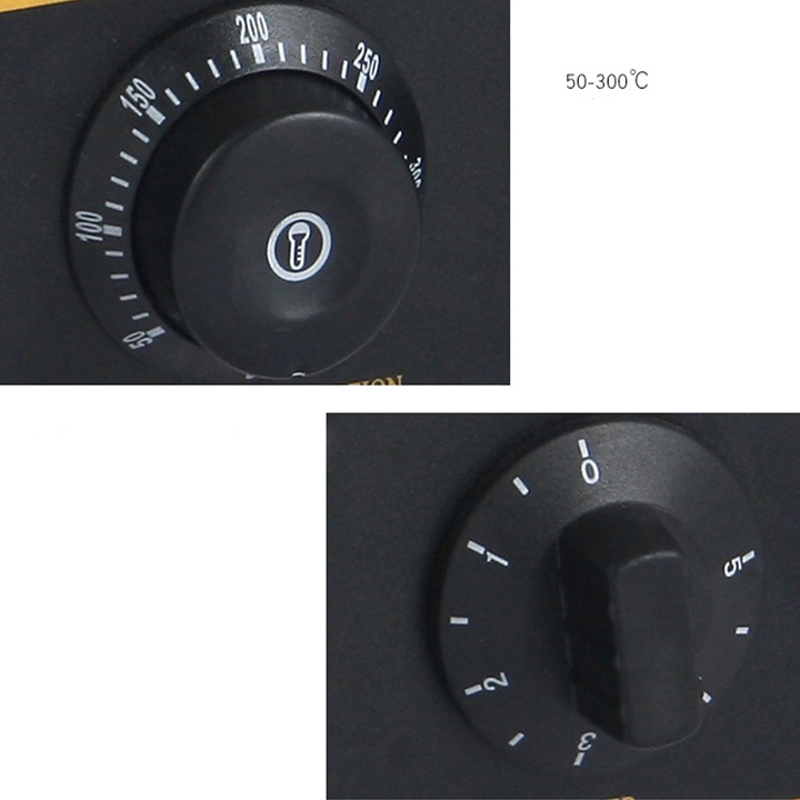 + Núm điều chỉnh nhiệt độ và thời gian: khi có điện, đèn báo nhiệt trên mặt điều khiển tự động bật, ngược lại tự động tắt khi đủ nhiệt.