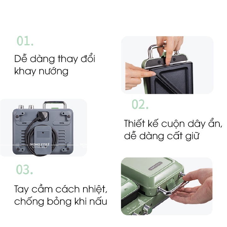 - 2 chức năng: Nướng bánh và nấu đồ ăn nhanh chóng. Bạn chỉ cần một khoảng thời gian từ 5 – 7 phút để có thể hoàn thành 1 chiếc bánh sandwhich nướng xinh xắn, thơm lừng