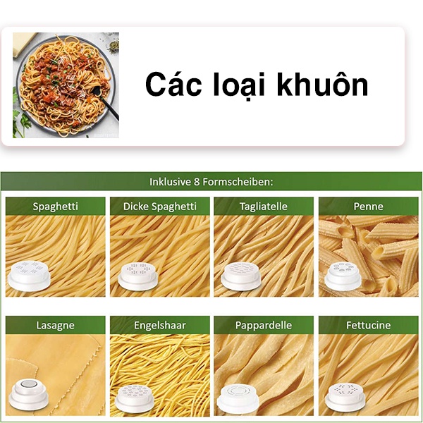 - 8 phụ kiện đính kèm giúp bạn có thể làm 15 món mì ống.
