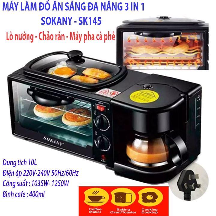Giới thiệu Máy làm đồ ăn sáng Chính Hãng SOKANY SK-145, Máy nướng bánh mì Sandwich kiêm Pha Cà phê - Bếp nướng đa năng 3 trong 1