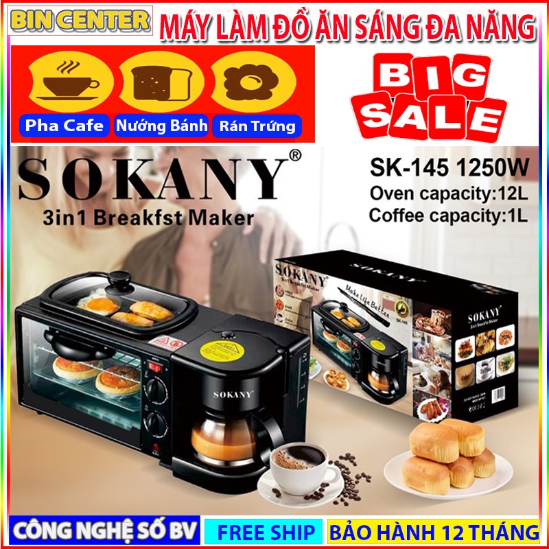 Máy làm đồ ăn sáng Chính Hãng SOKANY SK-145, Máy nướng bánh mì Sandwich kiêm Pha Cà phê - Bếp nướng đa năng 3 trong 1