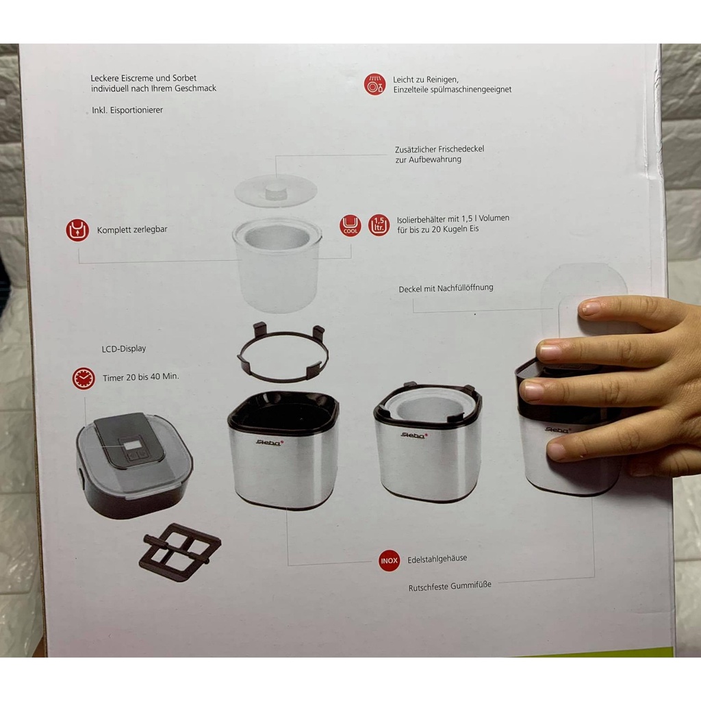 - Dễ dàng làm kem tại nhà theo sở thích. Hẹn giờ có thể được cài đặt lên đến 40 phút thông qua màn hình LED. Điều này có nghĩa là không chỉ kem sorbet hoặc kem mềm mà còn có thể sản xuất kem thật. Nắp có một lỗ nạp lại mà qua đó có thể thêm các loại hạt, trái cây hoặc các thành phần khác vào sau đó. Cũng bao gồm một muỗng kem.