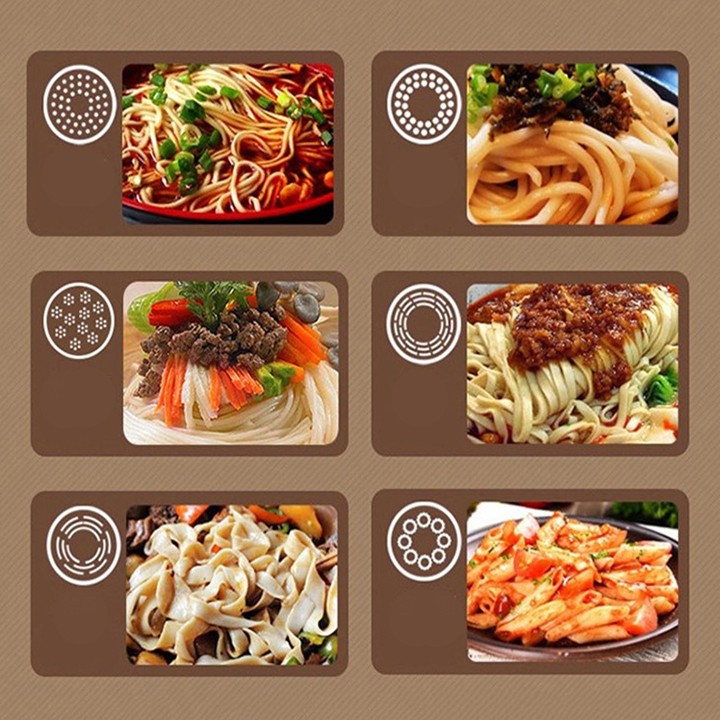 - Máy có 7 khuôn trong đó có 6 khuôn tạo sợ mỳ và 1 khuôn để làm vỏ bánh gối, vỏ há cảo...
