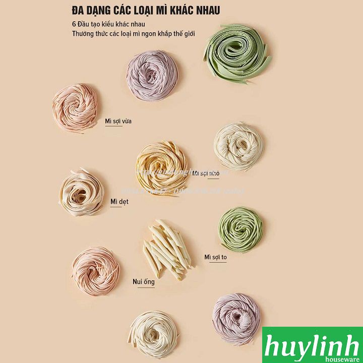 - Có 6 đầu tạo kiểu sợi: Mì sợi vừa, Mì sợi nhỏ, Mì dẹt, Mì sợi to, Nui ống,…