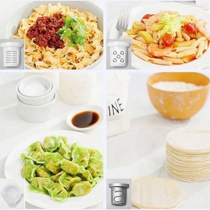 + Phụ kiện đi kèm: 13 Khuôn làm mì, bún ...,1 cốc đo bột, 1 cốc đo nước, 1 đầu gạt, 1 khay làm sủi cao (Shui jiao)