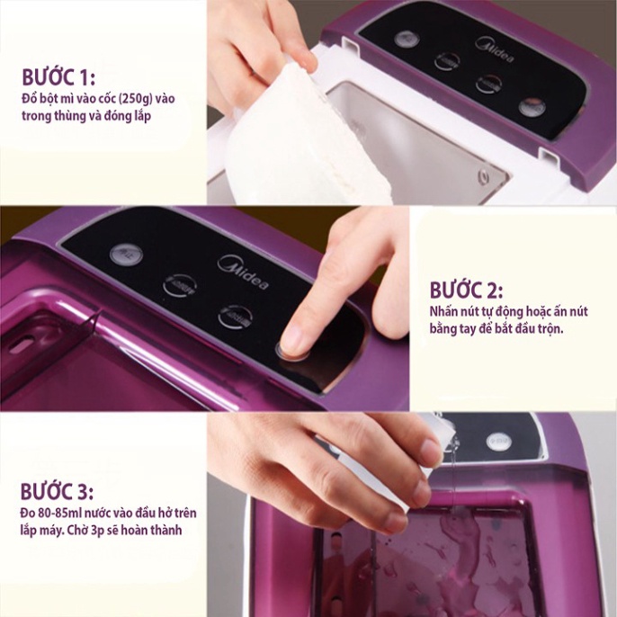 Khi chiếc máy làm mì MIDEA xuất hiện, việc làm bún, mì trở lên nhẹ nhàng, đơn giản hơn bao giờ hết: đổ nguyên liệu vào máy, bấm nút, thêm chất lỏng (nước/trứng) và sau 5 – 10 phút, những sợi mì, bún cứ như có phép thuật, cứ từ từ xuất hiện