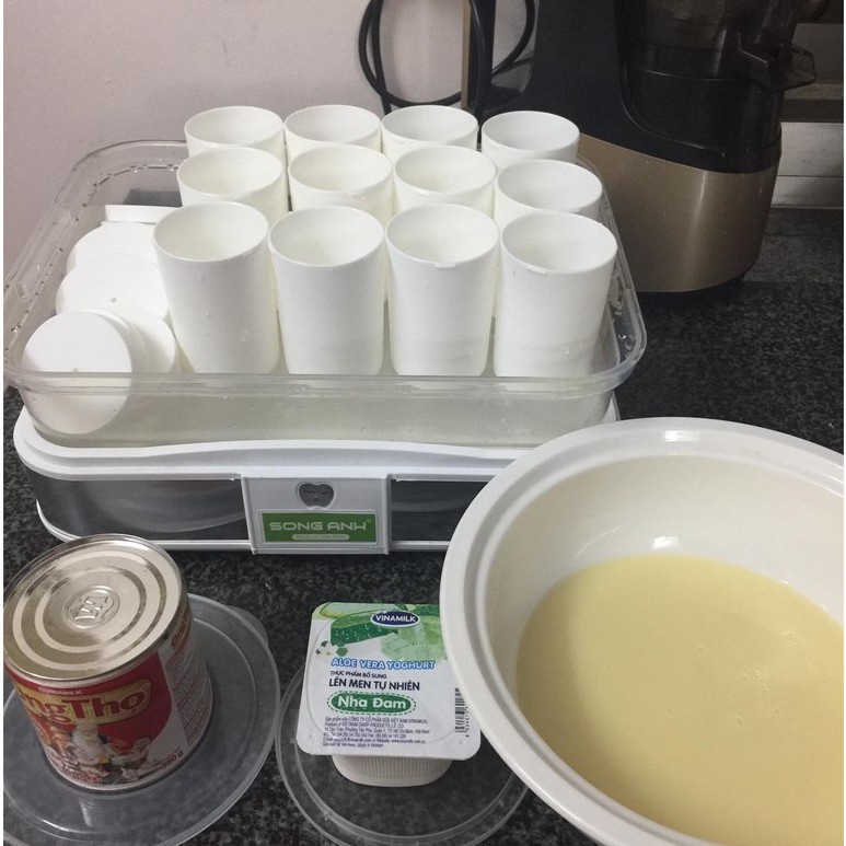 - Cho hỗn hợp vào các cốc có trong máy, tùy độ chua bạn mong muốn có thể ủ từ 5 - 6 tiếng cho mùa hè , từ 7 - 8 tiếng cho mùa đông (tính từ thời gian cắm điện).