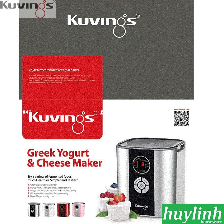 Máy làm sữa chua Kuvings KGC-712CB với chức năng làm sữa chua, làm pho mát, làm dấm-làm sirô, làm dưa muối-làm rượu trái cây, gồm 2 lồng ủ (lồng ủ này sử dụng được trong lò vi sóng nhưng không quá 2 phút), có màn hình hiển thị LCDSản phẩm được sản xuất tại Hàn Quốc, Huy Linh phân phối và bảo hành 12 tháng chính hãng