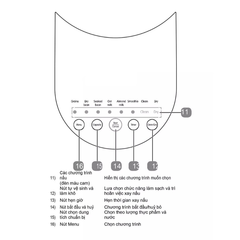 - 8 chương trình tự động và linh hoạt: Ngũ cốc (đậu đen, đậu gà, đậu xanh, gạo lứt...), hạt đậu nành khô, hạt đậu đã ngâm nước, sữa yến mạch, sữa hạnh nhân, sinh tố, vệ sinh, sấy khô.