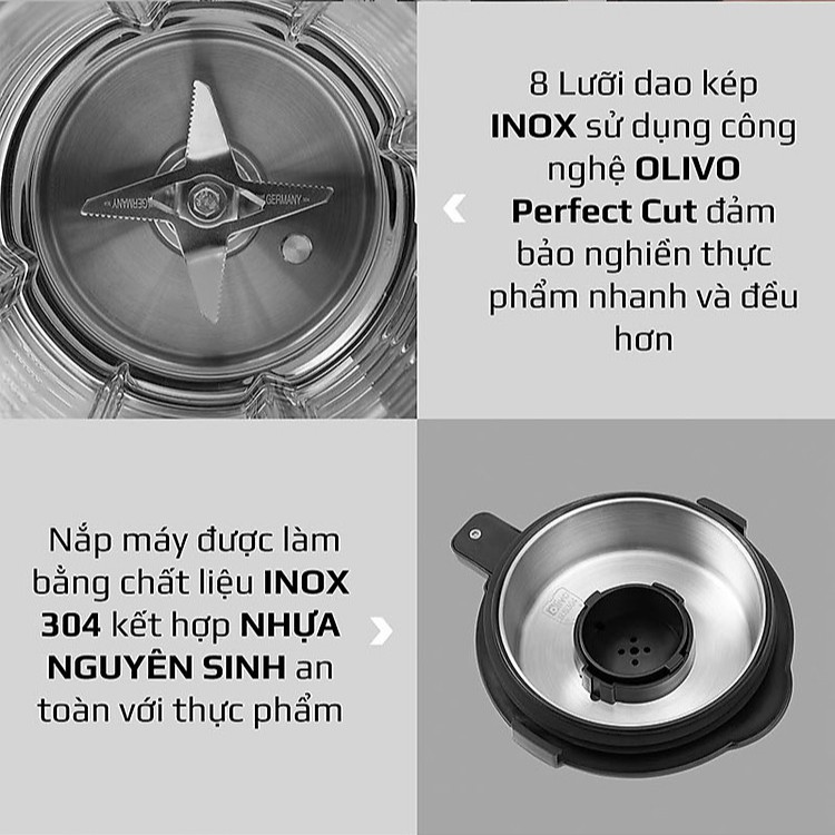✔️ LƯỠI DAO 8 CÁNH bằng INOX sử dụng công nghệ Olivo Perfect Cut đảm bảo nghiền thực phẩm nhanh và SIÊU MỊN.