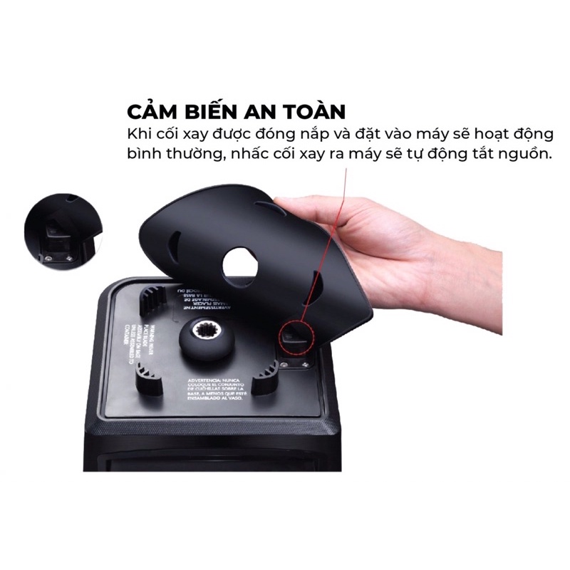 Chức năng an toàn: tự động tắt nguồn khi mở nắp, Chỉ khi cốc thủy tinh được đóng nắp và lắp ráp đúng vị trí thì máy mới hoạt động, nhấc cối xay ra, máy sẽ tự động tắt nguồn, đảm bảo an toàn cho người dùng và bảo vệ tốt cho thiết bị, tăng tuổi thọ máy.