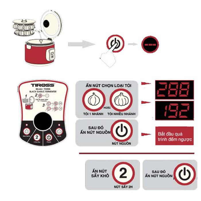 Bước 3: Nhấn nút chọn chế độ tỏi 1 nhánh hoặc tỏi nhiều nhánh, sau đó bấm nút nguồn để máy hoạt động (Đồng hồ sẽ hiển thị 192 (8 ngày) hoặc 288 (12 ngày) tùy thuộc vào chế độ mà bạn chọn.