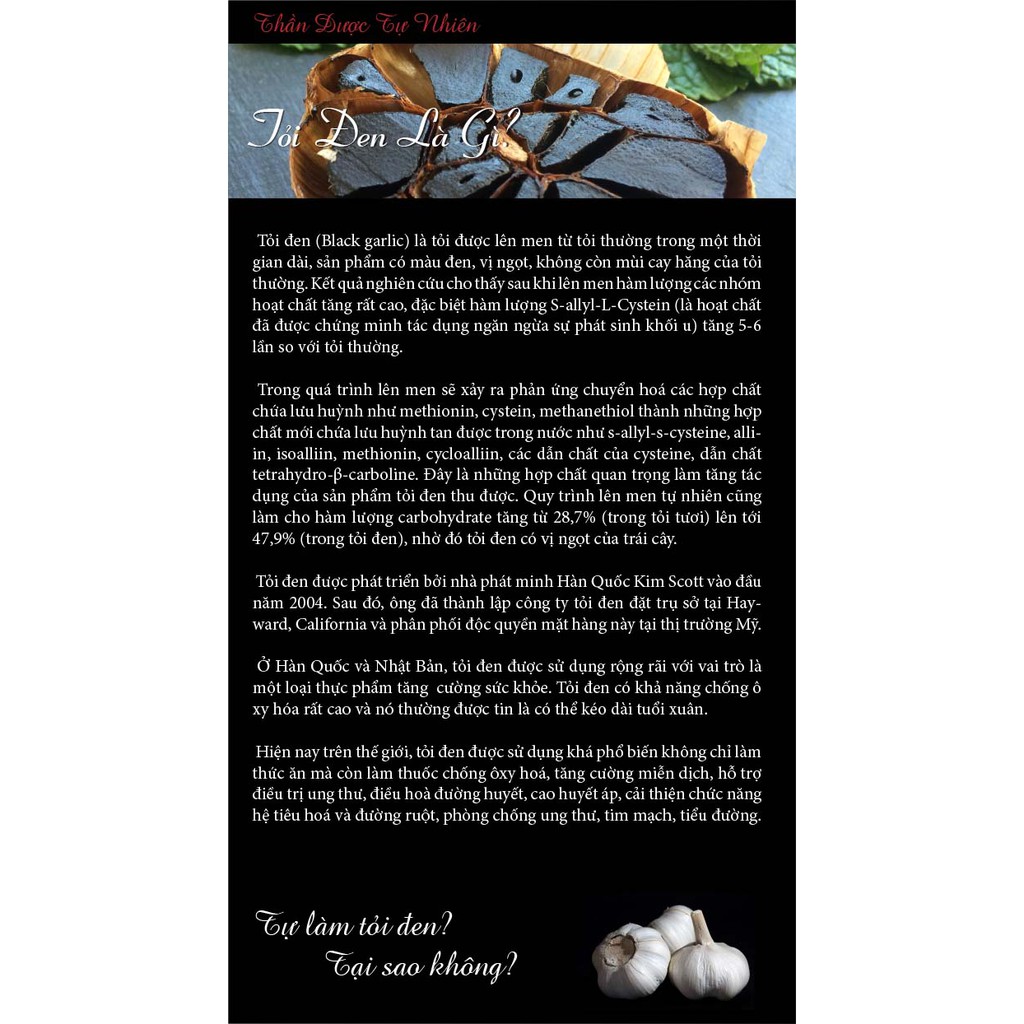 Tỏi đen được chế biến từ tỏi tươi sau khi trải qua quá trình lên men chậm trong điều kiện quản lý chặt chẽ về nhiệt độ và độ ẩm. Sau 45 - 60 ngày lên men, các hoạt chất trong tép tỏi tăng lên đáng kể, trong đó hàm lượng đường tổng tăng khoảng 13 lần, fructose tăng 52 lần, hoạt chất SAC (sallyl lcystein) - thành phần quan trọng nhất trong tỏi đen tăng 6 lần, ngoài ra hợp chất superoxide dismutase (SOD) tăng gấp 10 lần so với tỏi tươi có tác dụng phòng chống ung thư hiệu quả.