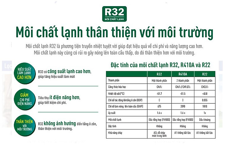 Loại gas này giúp giảm hiệu ứng nhà kính tránh gây thủng tầng ozone thân thiện với môi trường. Hơn thế nữa, gas R32 còn có hiệu suất làm lạnh nhanh hơn 1,6 lần so với những điều hoà sử dụng gas R410A và R22.