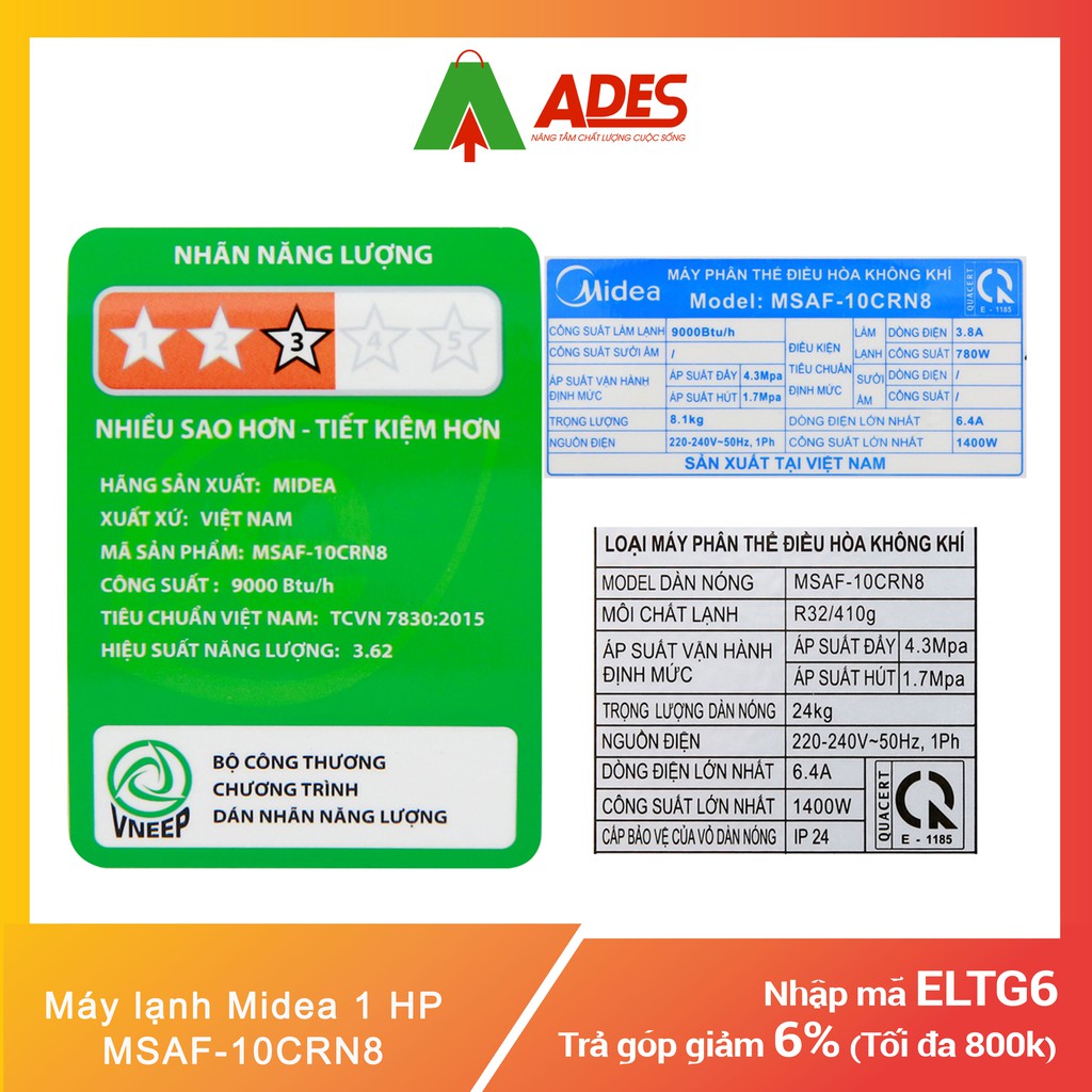 - Nhãn năng lượng tiết kiệm điện:3 sao (Hiệu suất năng lượng 3.62)