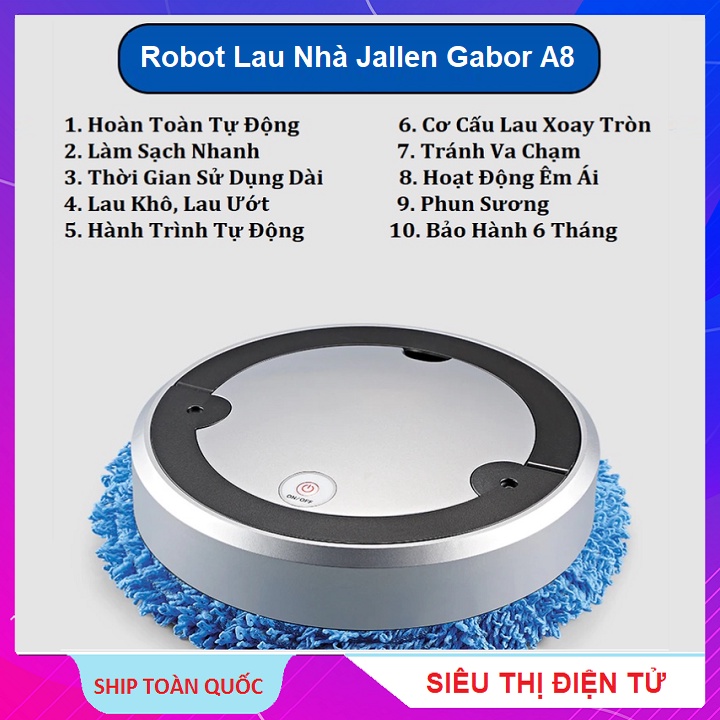 Máy Lau Nhà Thông Minh Lau Khô Và Ướt, Robot Lau Nhà Jallen Gabor A8 - Kết Hợp Xông Tinh Dầu - Thanh Lọc Không KhíRobot lau nhà - Máy lau nhà thông minh lau khô và ướt kết hợp xông tinh dầu thanh lọc không khí model A8 thực sự là một thiết bị hữu ích cho chị em đỡ vất vả trong công việc lau nhà. Chỉ cần cắm sạc pin rồi bấm nút là máy sẽ tự động lau sạch nền nhà trong khi bạn rảnh tay làm việc khác như xem phim, đọc báo, nấu cơm, trông bé .....