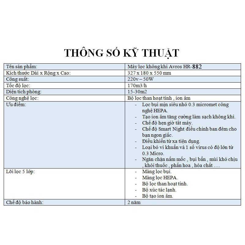 Giới thiệu Máy lọc không khí AVROS HR-882, bộ lọc HEPA 5 lớp, lọc sạch bụi, tạo ion, loại bỏ vi khuẩn, ngăn chặn nấm mốc hiệu quả