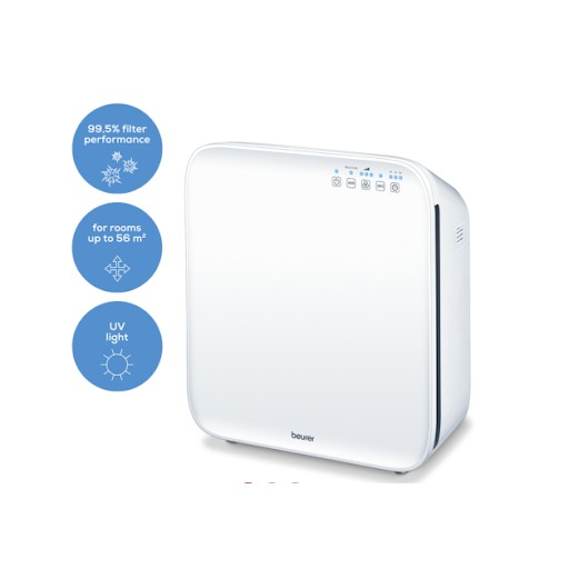 - Máy lọc không khí gia đình Beurer thích hợp cho phòng có diện tích 56m2 (theo tiêu chuẩn NRCC-54013-2011) phù hợp cho phòng khách, phòng ngủ. Khả năng cảm ứng phân tử bụi cực nhỏ giúp loại bỏ được hoàn toàn các vi khuẩn có hại, ngăn chặn ẩm mốc.