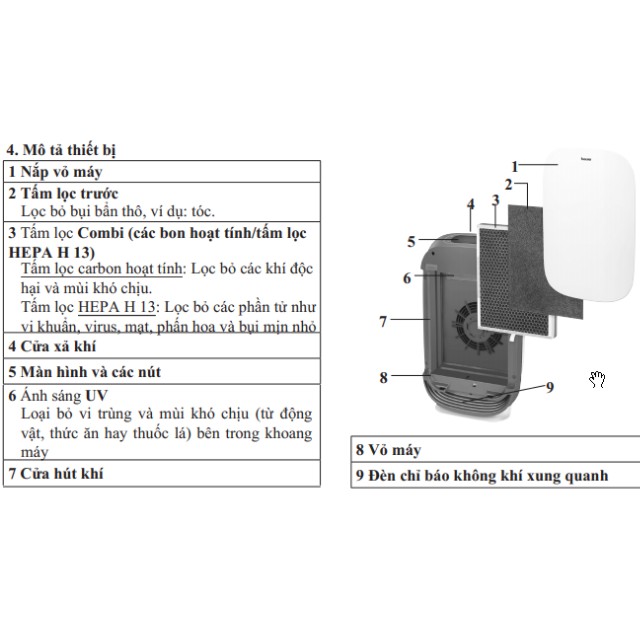 - Lọc không khí với bộ lọc combi (carbon hoạt tính tấm lọc HEPA H13 có khả năng loại bỏ tới 99,95% các phần tử nhỏ như vi khuẩn, virus, phấn hoa, bụi mịn.