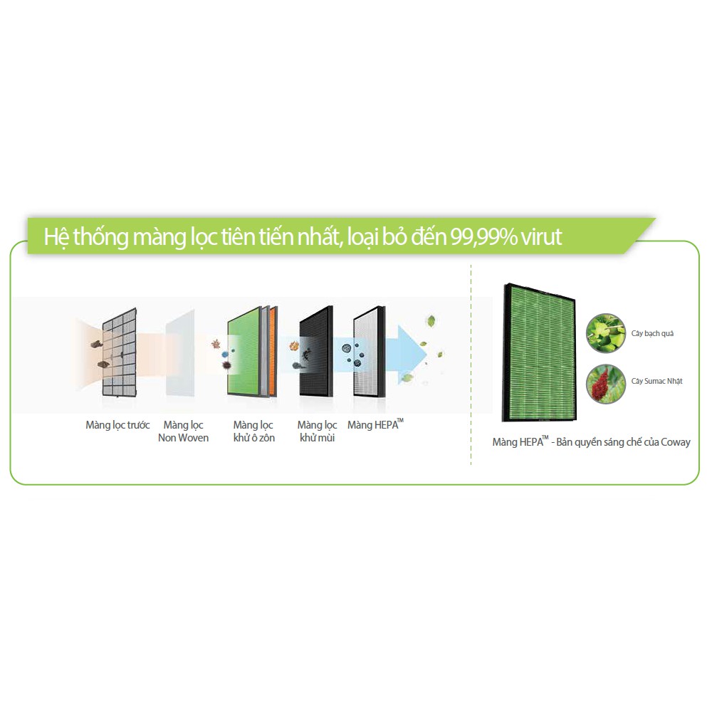 - Máy lọc không khí Coway AP-3008FHH thế hệ mới với 5 màng lọc, trong đó màng lọc HEPA độc quyền của Coway giúp không khí được lọc 1 cách tinh khiết nhất. Bên cạnh đấy là màng lọc virut, khử mùi giúp loại bỏ đến 99,9% virut, vi khuẩn và mùi hôi ẩm mốc