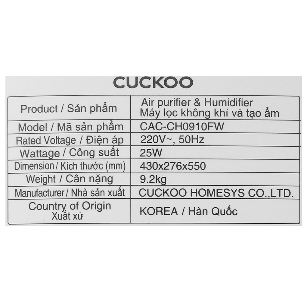 Thiết Bị Điện Gia Dụng > Thiết bị điện gia dụng nhỏ > Thiết bị xử lí không khí > Máy lọc không khí || [Mã ELHA22 giảm 5% đơn 300K] Máy lọc không khí Cuckoo CAC-CH0910FWCòn hàng