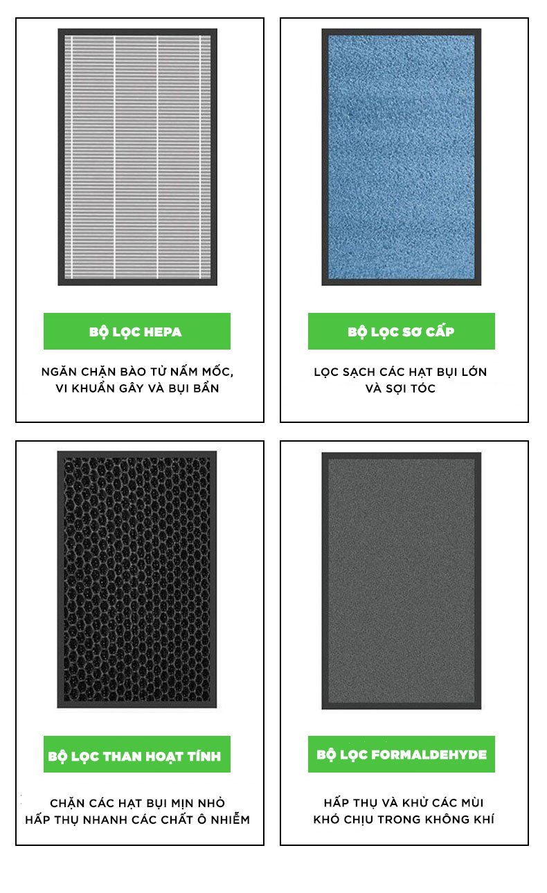 - Máy lọc không khí có màng lọc 4 lớp dày 35cm cao cấp và bộ cảm biến giúp lọc sạch bụi bẩn, nấm mốc, lông chó mèo, tóc rụng, khử mùi thức ăn, các hạt bụi nhỏ li ti trong không khí mà mắt thường không nhìn thấy được. Đặc biệt máy có sử dụng bộ lọc HEPA giúp lọc 99,98% bụi bẩn có hại và vi khuẩn trong không khí, rất thích hợp cho những gia đình có trẻ nhỏ và người già (nhất là trẻ sơ sinh).