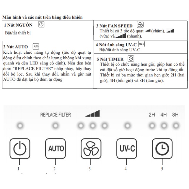 - Chức năng hẹn giờ, cho phép người dùng cài đặt thời gian chạy của thiết bị trước khi thiết bị tự động tắt (2, 4 hoặc 8 giờ)