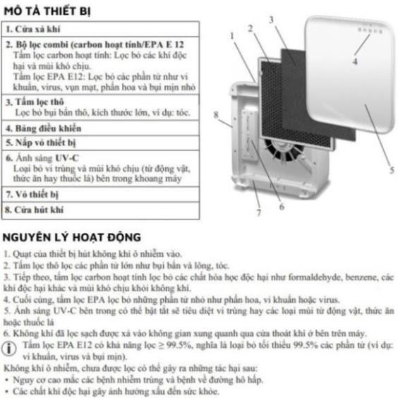 - Lọc không khí với bộ lọc combi (carbon hoạt tính loại bỏ các loại khí gây hại và mùi khó chịu, tấm lọc EPA E12 loại bỏ các phần tử như vi khuẩn, virus, phấn hoa và bụi mịn nhỏ.