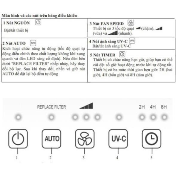 - Chức năng hẹn giờ, cho phép người dùng cài đặt thời gian chạy của thiết bị trước khi thiết bị tự động tắt (2, 4 hoặc 8 giờ)