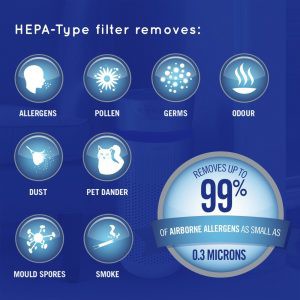 - Loại bỏ 99,0% vi khuẩn: Với chức năng lọc 360 độ bằng màng lọc HEPA giúp loại bỏ 99,0% vi khuẩn trong không khí và các chất gây dị ứng như phấn hoa, bụi, khói, vẩy da thú cưng, bào tử nấm mốc và vi trùng.