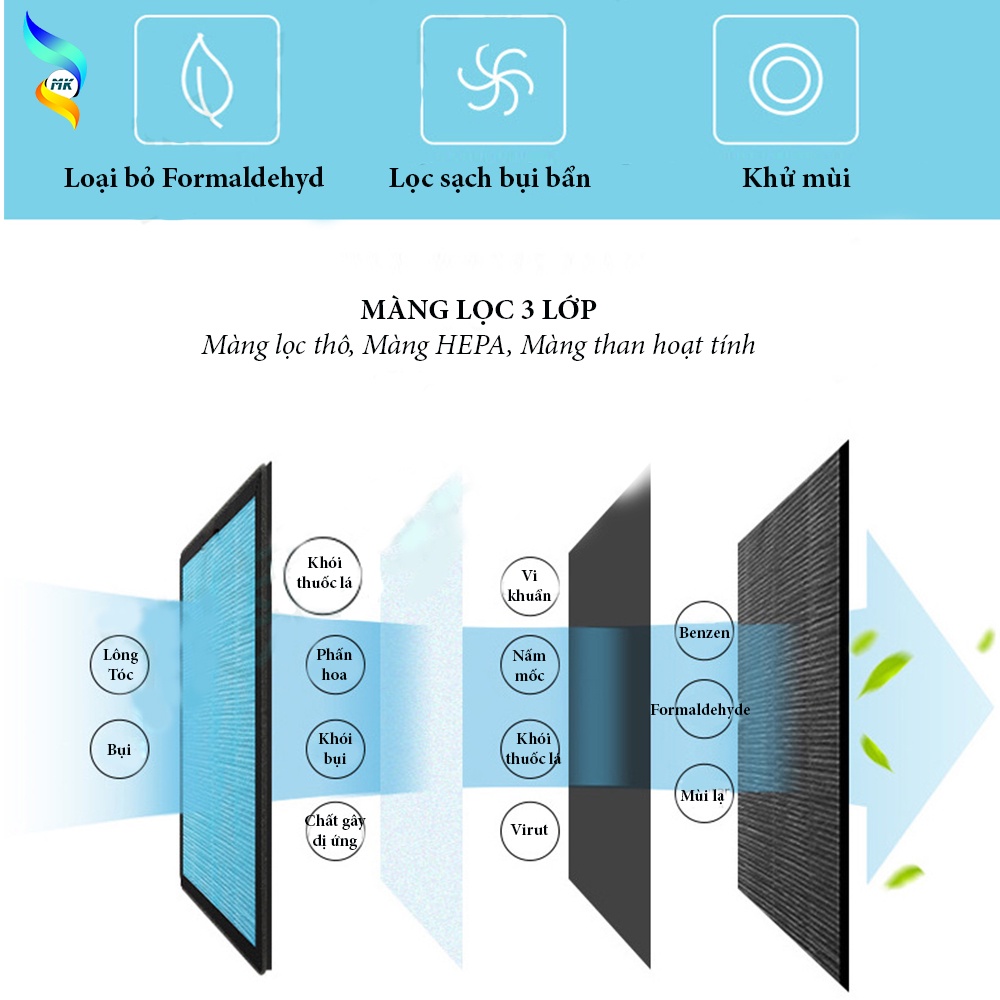 - Lọc sạch khói bụi với kích cỡ siêu nhỏ PM2.5 (bụi siêu mịn, phấn hoa,..)