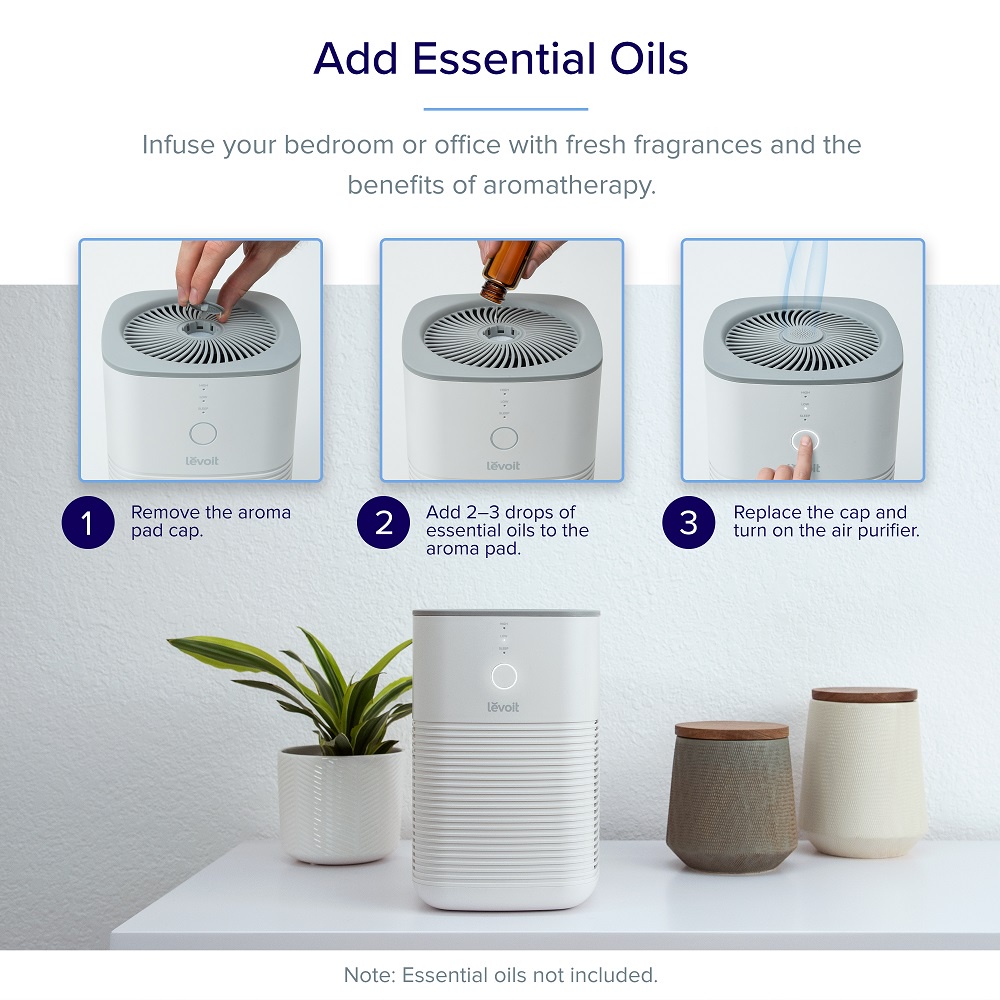 Kết hợp trị liệu bằng hương thơm- tinh dầu : Thêm 2-3 giọt tinh dầu yêu thích của bạn vào miếng thơm dưới nắp. Chỉ động tác nhỏ đó, máy lọc không khí này có thể phân phối hiệu quả và lan toả không khí sạch đầy hương thơm tươi mát đi khắp phòng của bạn.