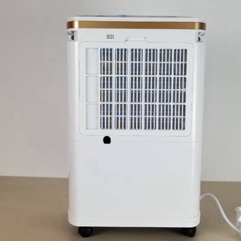 Máy hút ẩm không khí thiết kế màu trắng sang trọng phối thêm viền vàng đồng nổi bật, được trang bị 4 bánh xe giúp di chuyển dễ dàng. Dung tích bình nước thải là 3 lít.