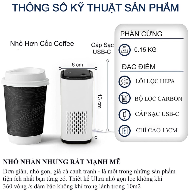 - Sản phẩm bao gồm: máy lọc không khí mini và cáp sạc USB-C (không bao gồm lõi lọc)