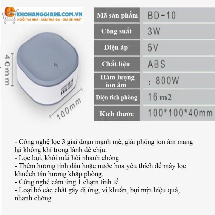 Thông số kỹ thuật máy lọc không khi máy khử mùi ô tô BD-10