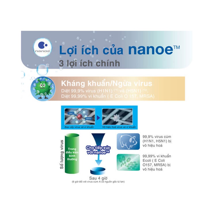 Công nghệ Nanoe TM là diệt 99,9% vi khuẩn (E Coli O 157, MRSA) và 99. 9% virus (H1N1, H5N1) sau 4 giờ hoạt động. Bên cạnh đó công nghệ này còn giúp khử mùi hiệu quả (giảm xuống 1 bậc) đối với mùi thuốc lá bém trên độ vật như rèm cửa và ghế sofa.