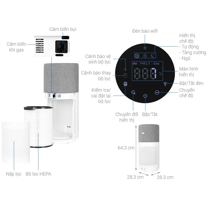 ↝ Lọc: HEPA, Than hoạt tính, Bộ tiền lọc
