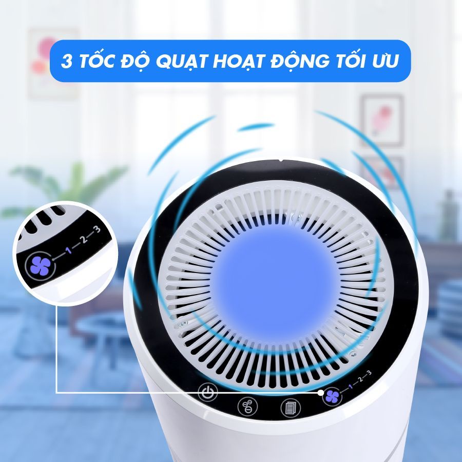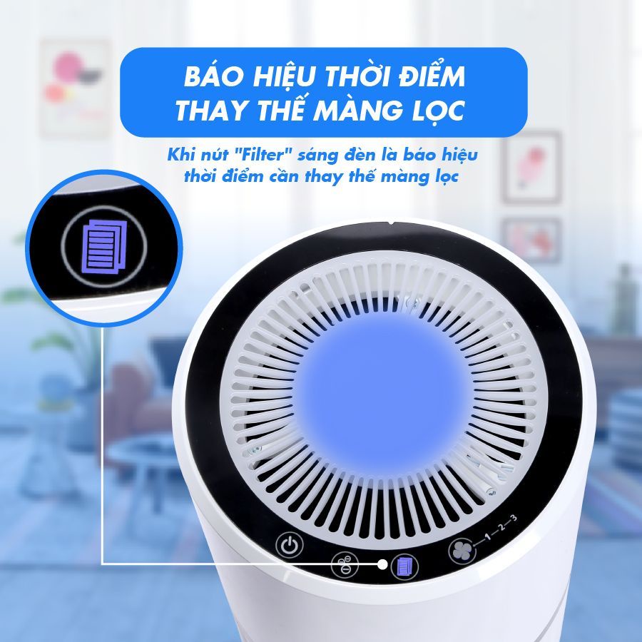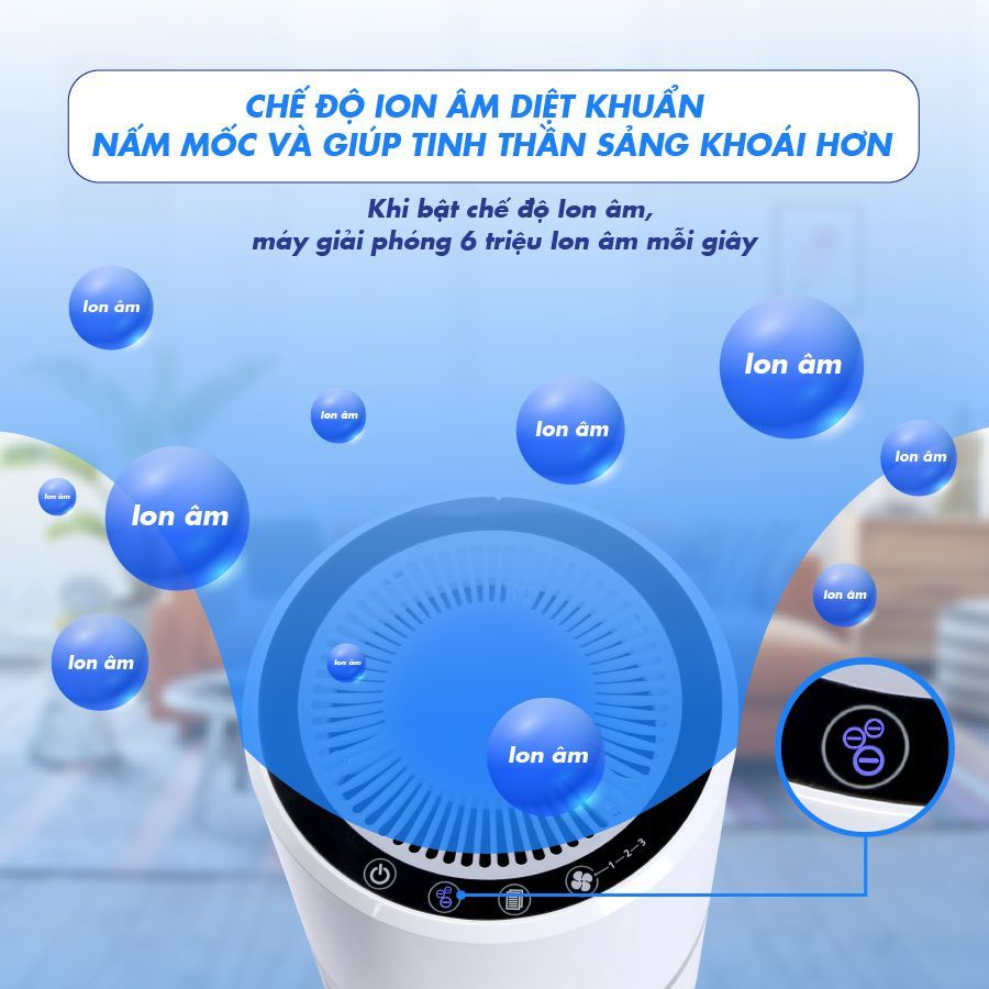 - Khi bật chế độ ion âm, máy giải phóng 6 triệu Ion âm mỗi giây, tốt cho sức khỏe đồng thời khử mùi, loại bỏ các loại bụi siêu nhỏ và chất rắn lơ lửng trong không khí.
