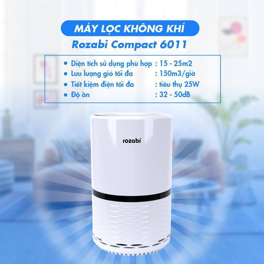 - Máy lọc không khí Rozabi Compact 6011 có chế độ ion âm kết hợp với màng lọc Hepa H13 làm tăng khả năng lọc bụi, diệt khuẩn, nấm mốc lên tới 99.99%.