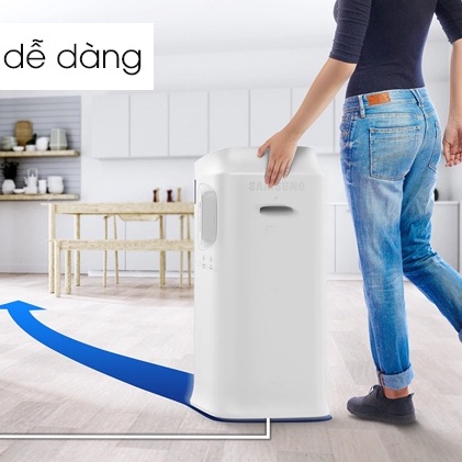 - Máy lọc không khí Samsung kết cấu vững chắc, màu trắng đen sang trọng, có bánh xe di chuyển linh hoạt