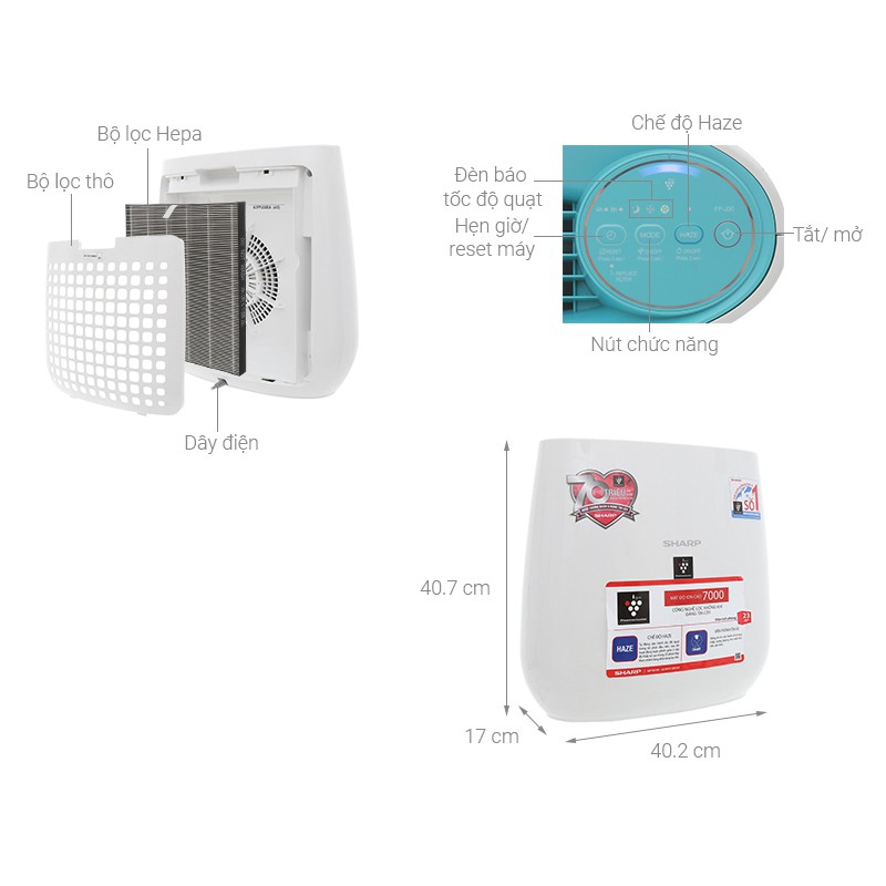 Tiện ích:Plasmacluster Ion mật độ cao tiêu diệt nấm mốc trong không khí, khử mùi thuốc lá, phấn hoa, Lọc được bụi mịn PM 2.5, Lọc nhanh với chế độ Haze, Hẹn giờ tắt