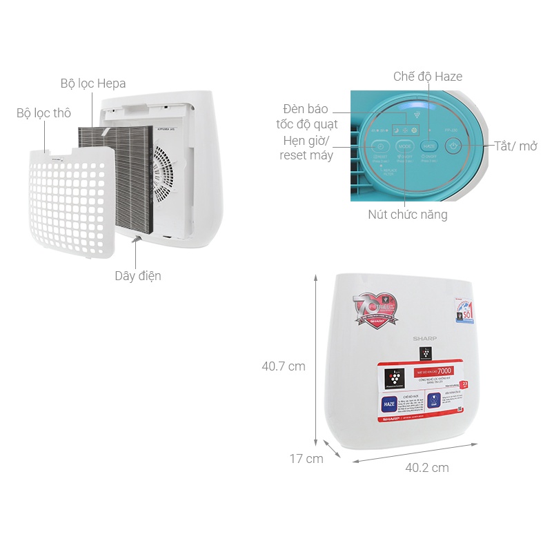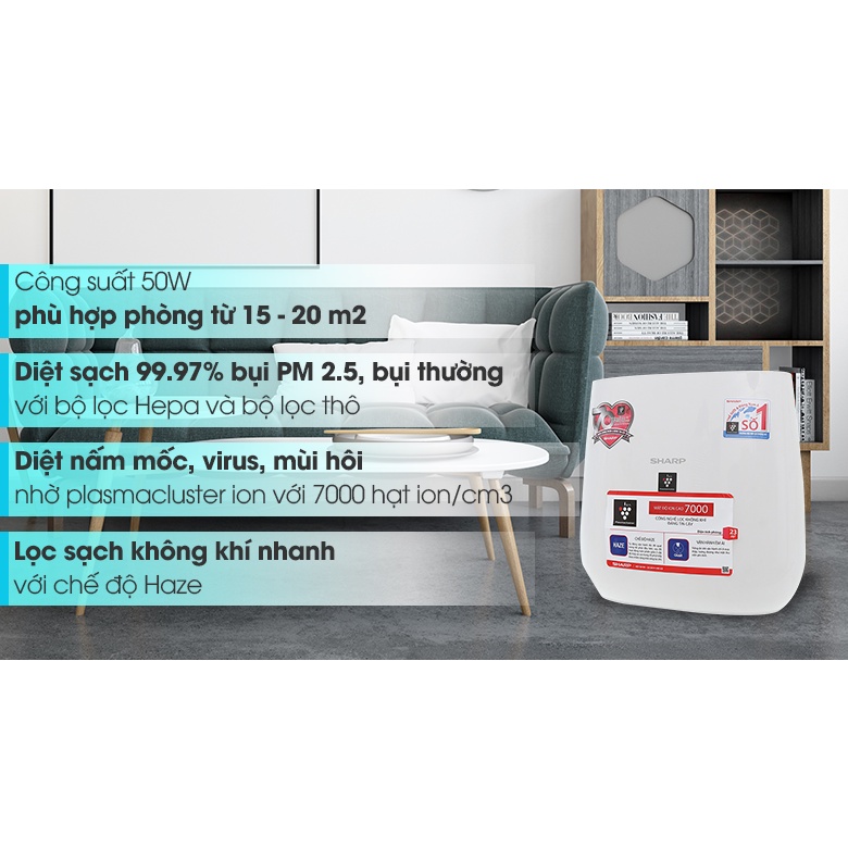 - Máy lọc không khí kết hợp với khả năng giải phóng Plasmacluster ion mật độ cao 7000 hạt ion/cm3 giúp ngăn chặn và tiêu diệt các tế bào nấm mốc, tác nhân dị ứng, mùi hôi, virus và tái tạo phân tử nước trong không khí giúp không gian sạch thoáng, an toàn và mát mẻ.