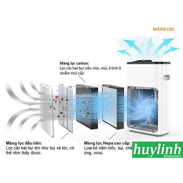 - Chiếc máy lọc không khí này được trang bị màng lọc gồm màng lọc đầu tiên, màng lọc cacbon, màng lọc HEPA (H13). Màng lọc đầu tiên giúp lọc các hạt bụi lớn như bụi và tóc, các loại bụi có thể nhìn thấy được. Màng lọc carbon: Lọc các hạt bụi siêu mịn, mùi, tránh ô nhiễm thứ cấp. Màng lọc Hepa: Loại bỏ nấm mốc, chất gây dị ứng, bụi, virus.