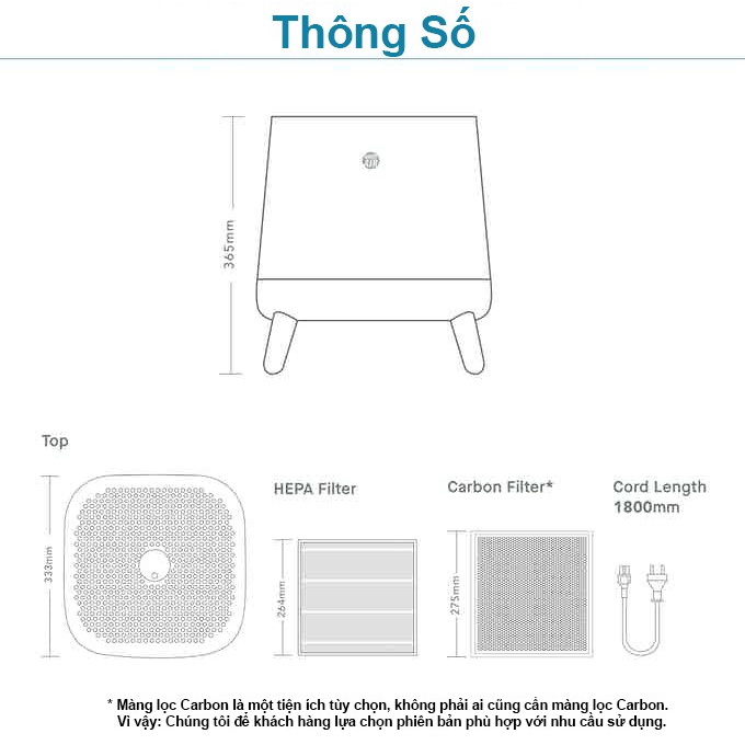 Tốc độ lọc : 70 – 180 – 315 (1 – 2 – 3)m3/h Hiệu năng cao, chỉ mất 25 phút để làm sạch không khí trong căn phòng có diện tích 40m2 (đối với phòng trống, 30-50 phút cho căn phòng có nhiều đồ đạc). Độ ồn : 23 – 43 – 52db (1 – 2 – 3) – thấp hơn nhiều so với các dòng máy khác, chỉ như tiếng gió thổi. Thiết kế thanh lịch, tính di động cao, phù hợp với mọi căn phòng. Màng lọc HEPA do công ty 3M của Mỹ sản xuất có tuổi thọ 6-8 tháng, giá 450.000đ Máy được bảo hành 1 năm.