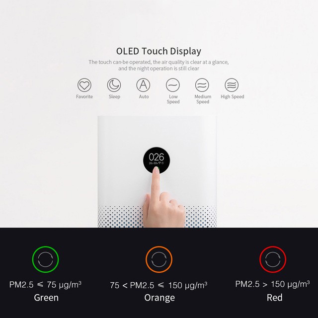 ✔ Màn hình cảm ứng OLED tròn được trang bị ngay mặt trước của Xiaomi gen 3 giúp hiển thị giá trị PM2.5, nhiệt độ, độ ẩm, chế độ làm việc của bộ lọc. Đặc biệt vòng tròn 3 màu thể hiện chất lượng không khí ngay thời gian thực. Cụ thể khi chất lượng không khí kém vòng sẽ hiển thị màu đỏ, màu cam cho chất lượng bình thường và màu xanh lá cây là chất lượng không khí tuyệt vời