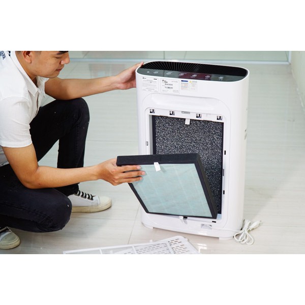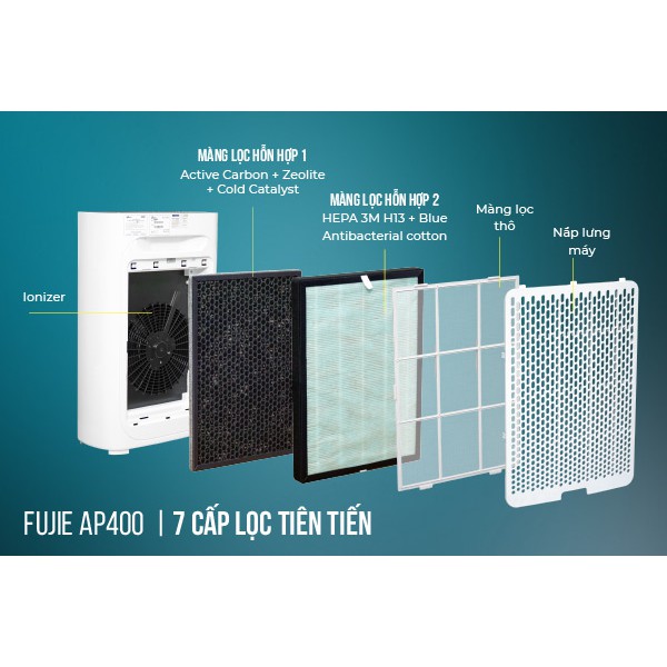 - Máy được tích hợp tới 7 cấp lọc: 1. Lưới lọc thô, 2.cấp lọc Carbon than hoạt tính, 3. Cấp lọc HEPA 3M H13, 4. màng lọc xúc tác lạnh (Cold Catalyst). 5. Cấp màng lọc Bông kháng thể màu xanh (Blue antibaterial cotton). 6. Cấp màng lọc Zeolite. 7. Cấp lọc Ionizer.