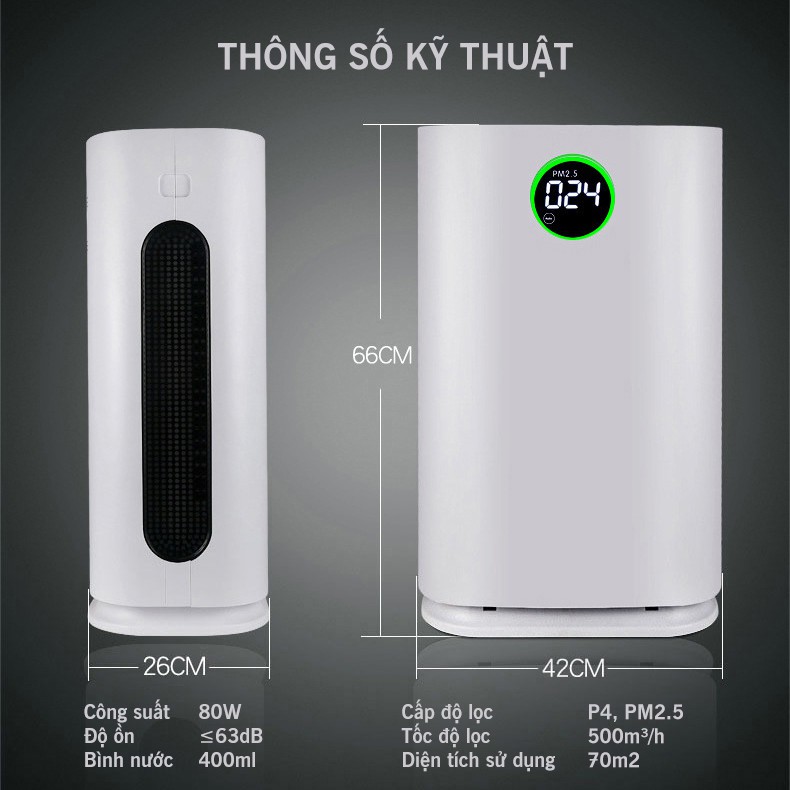 ----------------------------------------------------------Bảo hành 12 tháng lỗi 1 đổi 1-------------------------------------------------------Diện tích lọc khí và tạo ẩm tối đa 50m2- 70 m2