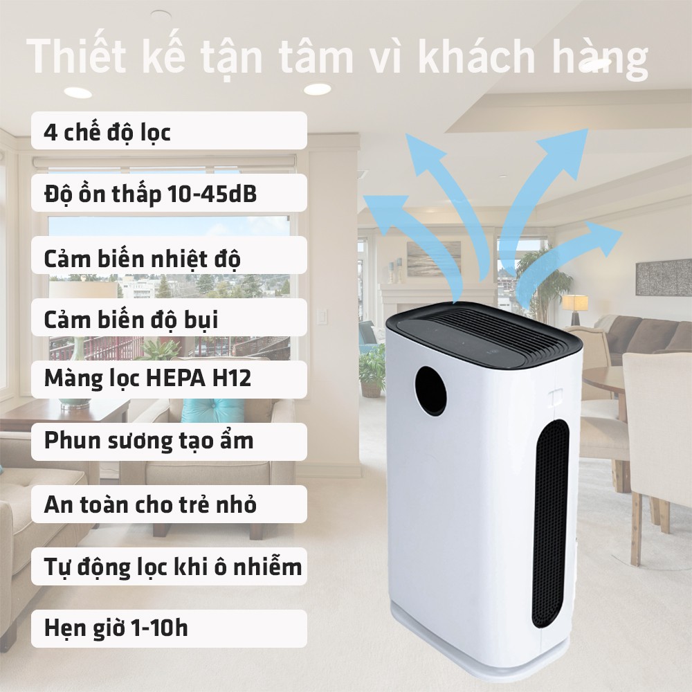 Máy lọc không khí tích hợp cấp ẩm cho phòng diện tích rộng 50 - 70 m2 tiêu chuẩn châu âu Vie Home