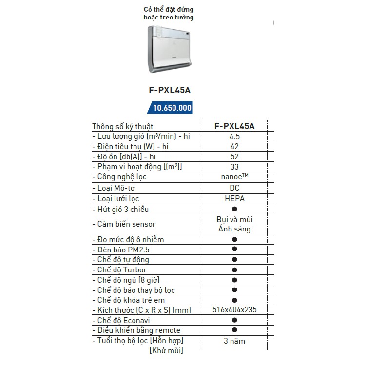 Máy lọc không khí Panasonic F-PXL45, model mới nhất của Panasonic tại thị trường Việt Nam. Một sản phẩm sở hữu thiết kế hiện đại, bắt mắt ngay từ ánh nhìn đầu tiên. Một ưu điểm tuyệt vời nữa mà không có dòng sản phẩm máy lọc không khí nào khác có được đó chính là khả năng lắp đặt linh hoạt.