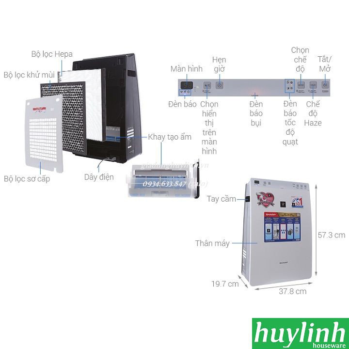 - Đèn hiển thị: Đèn báo cấp độ quạt, Đèn báo chất lượng không khí